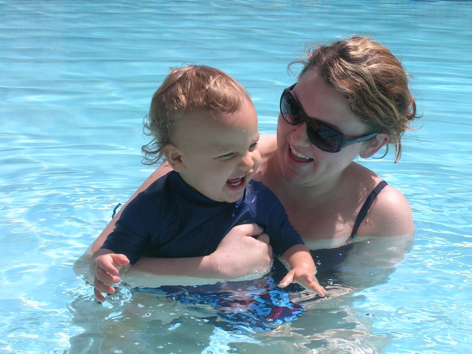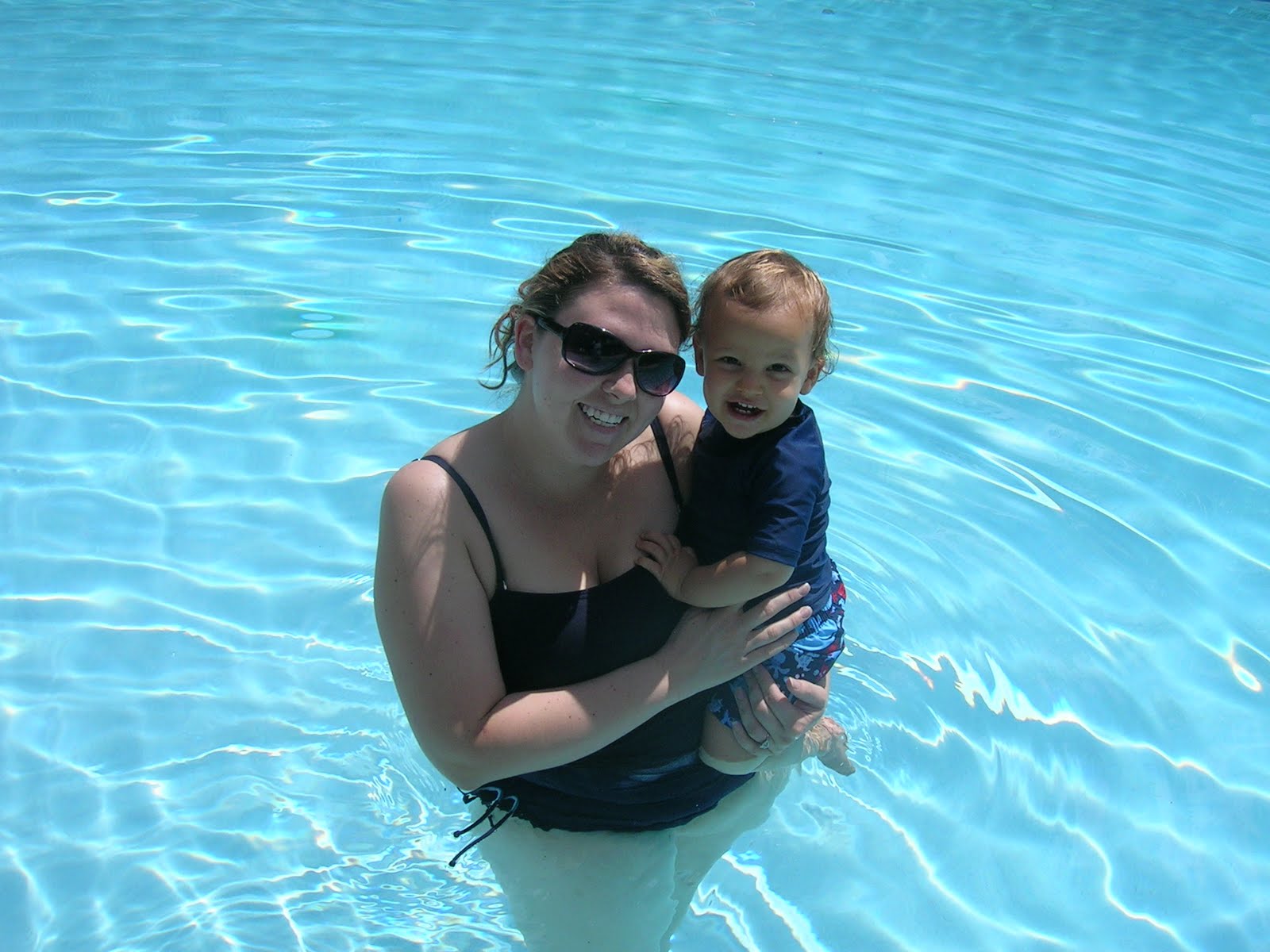 There will be pictures in this post. Some of them will feature Joshua with me as a background image. I will be in a swimsuit. For the sake of your retinas, focus on the cute baby, mmkay? Seeing me in a swimsuit might scar you for life and make you never want to have children, if you don’t have them already (and this suit covers up the strechmarks that have taken over my abdomen). If you do already have a child (or two or three), seeing me in a swimsuit will either make you say “Whew…glad I bounced back better than THAT” or you’ll sigh in sympathy with my enormous thighs and jiggly upper arms and pasty skin due to not having any leisure time to work on my tan.