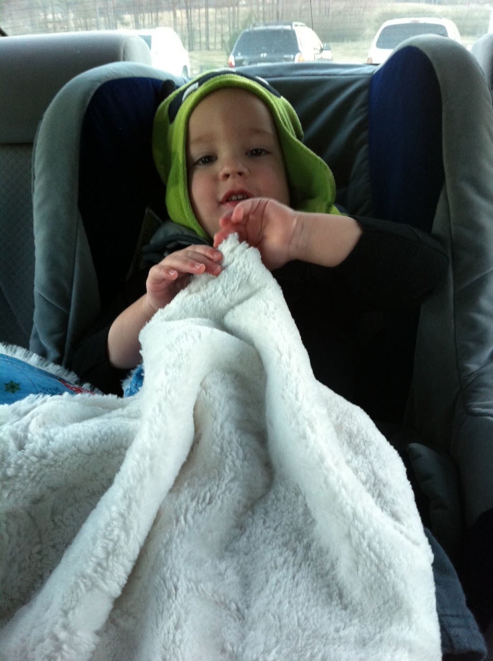 I’ve also grabbed this a time or two on the way out the door to use as a lap blanket for Joshua when it’s really cold in the car in the mornings. Since it’s not safe to put babies in car seats with their coats on, he needs a little warmth until the heat gets going. And he loves the blanket! See?